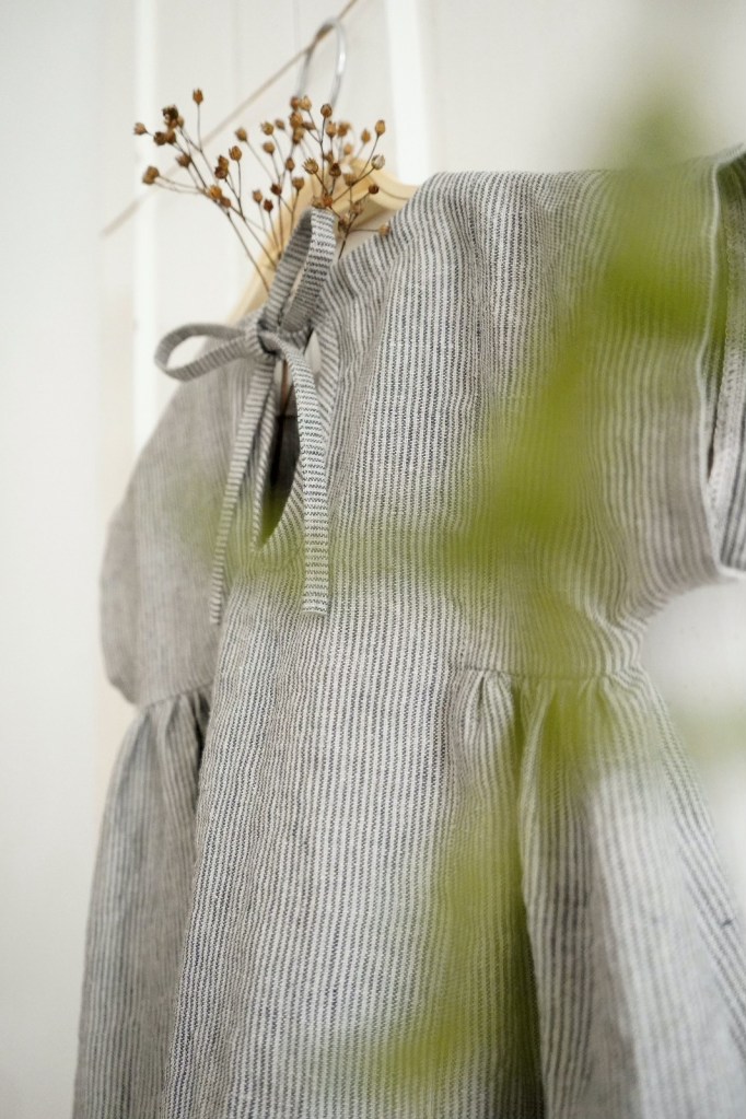 Material: 100% Baumwolle, OekoTex zertifiziert. Dieser Stoff hat eine Ähnlichkeit mit Musselin und Leinen, ist langlebig, atmungsaktiv, extrem weich und hat ein perfektes mittleres Gewicht. Der Stoff wurde bei Herstellung vorgewaschen (stonewashed) und verleiht dem Kleid eine schöne gewaschene Kräuselung.